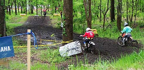 We rolled into Diamond Don’s just about 15 minutes after Andy had arrived so that was good timing. We jumped into Andy’s rental car and drove around looking for a place to park. Lots of the spaces were already taken but we found a large grassy section that faced the starting area of the track. We would have some of the best seats in the house, we though. Everything was wet as it could be. Standing water in several areas. Besides the area where we parked, most of the track was located in a wooded area. We walked the track and found that it was wider and faster than I pictured. Most was covered in new grass and there was about 3 man made jumps thrown in. Looked like fun. We saw Mark Eichorn, Darrin Tucker, Ron Kahan and Phil Ketchum plus lots of other familiar faces. I even see a gal with the sidecars and take an educated guess and introduce myself to Janette who hangs out on the Hodaka site. It was like a family reunion.